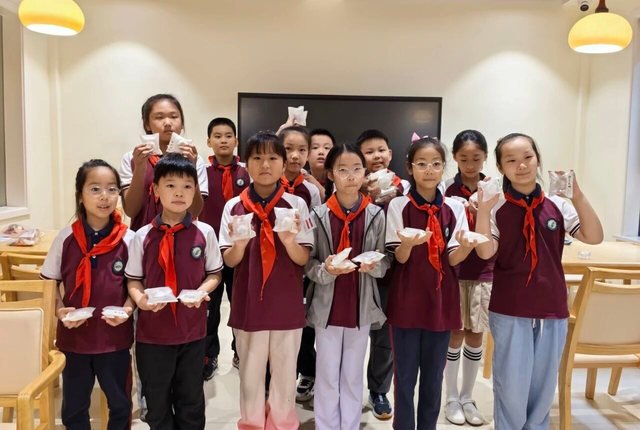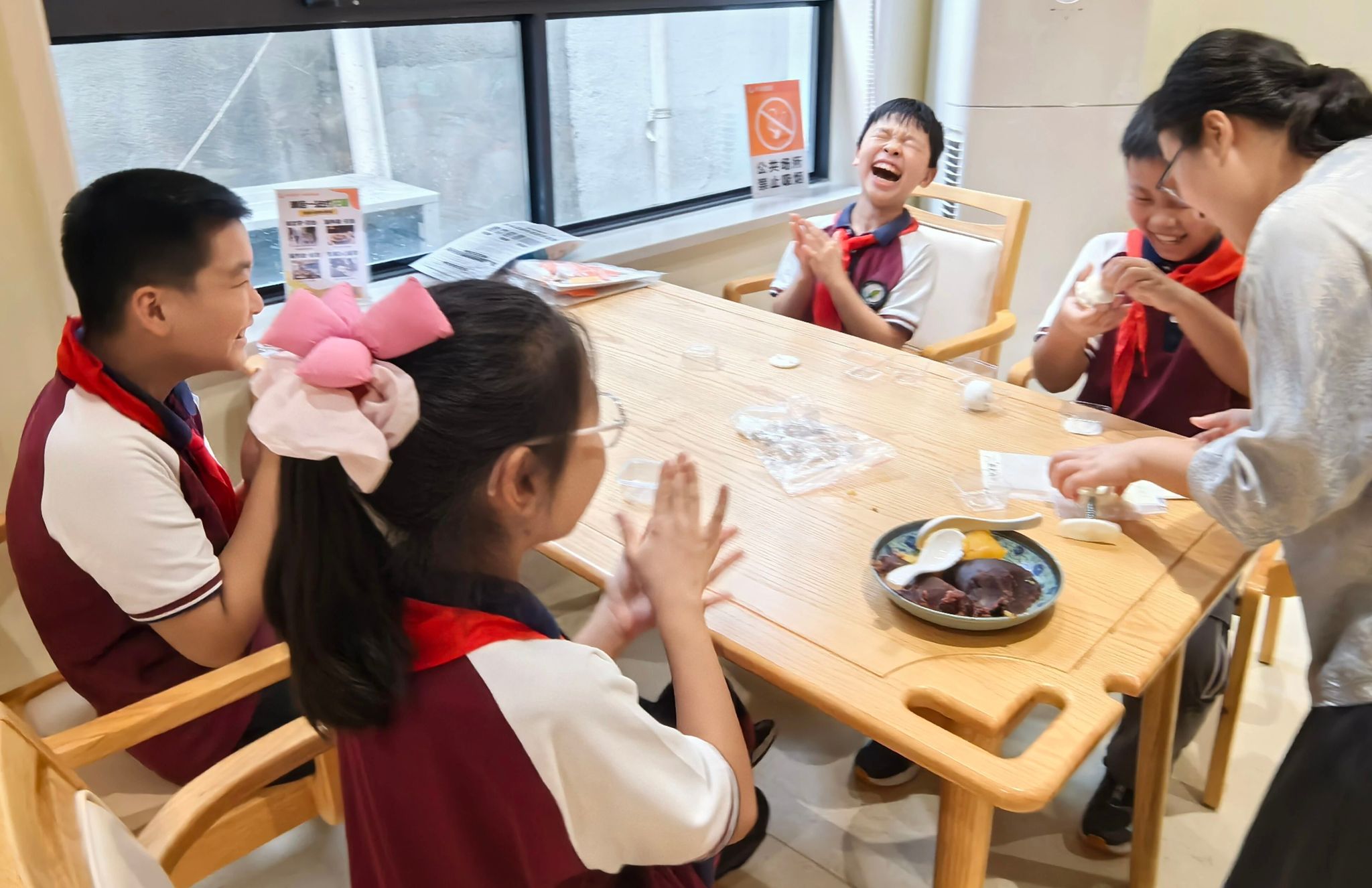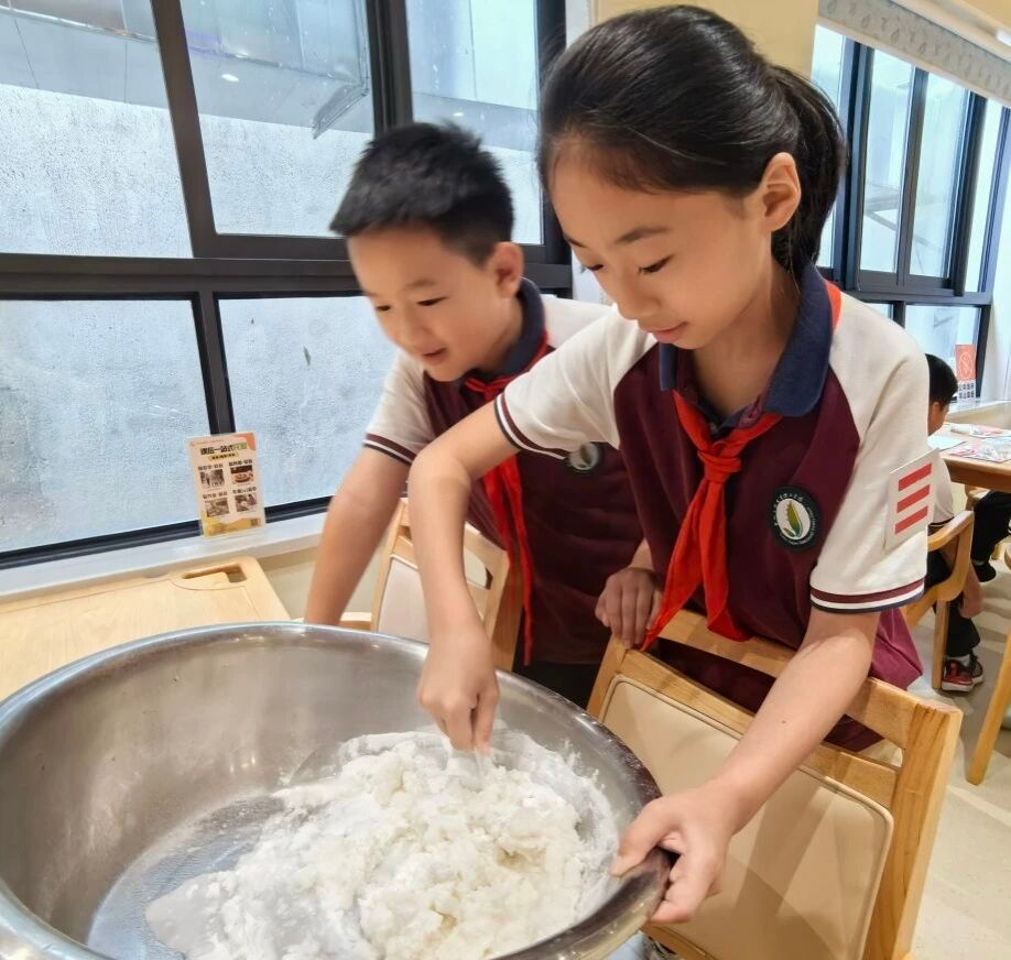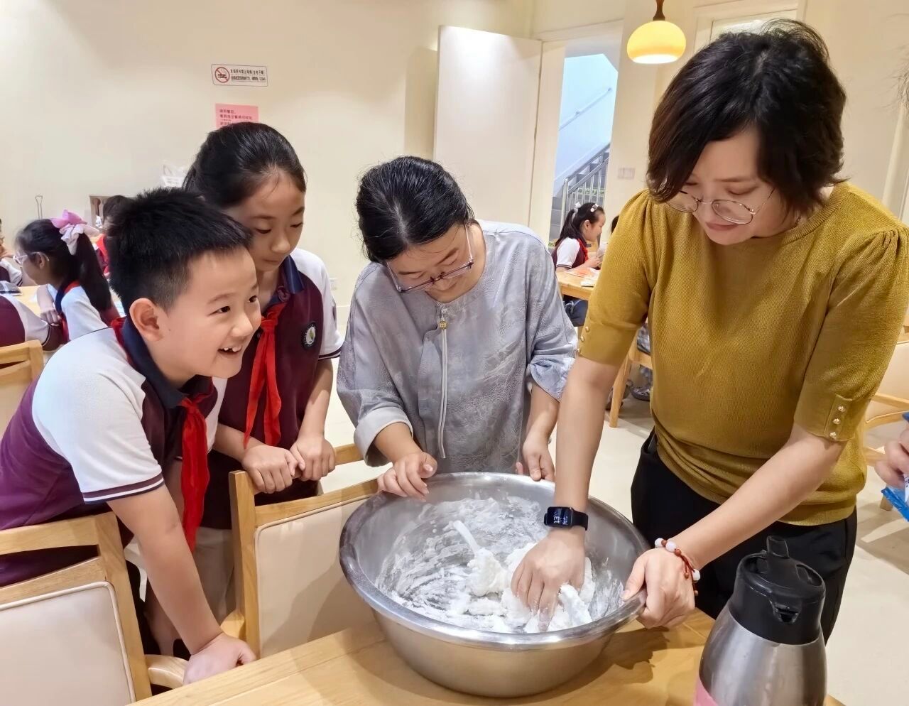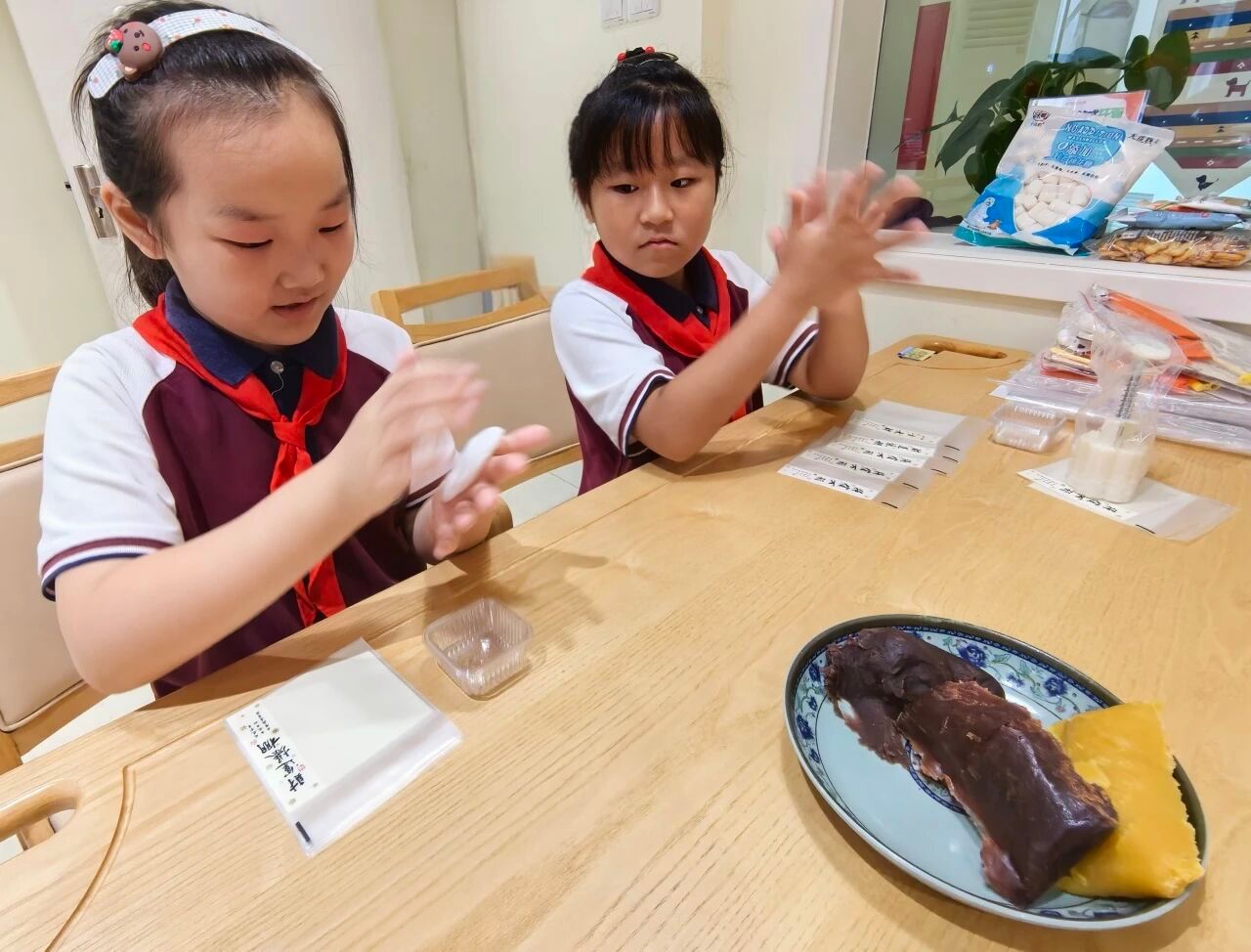 待面团冷却后,同学们拿到了分成小块的面团后立刻围坐在桌前摩拳擦掌。在老师和志愿者的指导下,大家先将面团揉成圆球,再用大拇指按出小坑,舀起豆沙、紫薯、奶黄等馅料放入其中,小心翼翼地将皮包裹住馅,再次揉圆后放进月饼模具。随着“啪”的一声轻响,一个个印着花纹的冰皮月饼便成型了,有玉兔、有桂花,造型精致可爱。