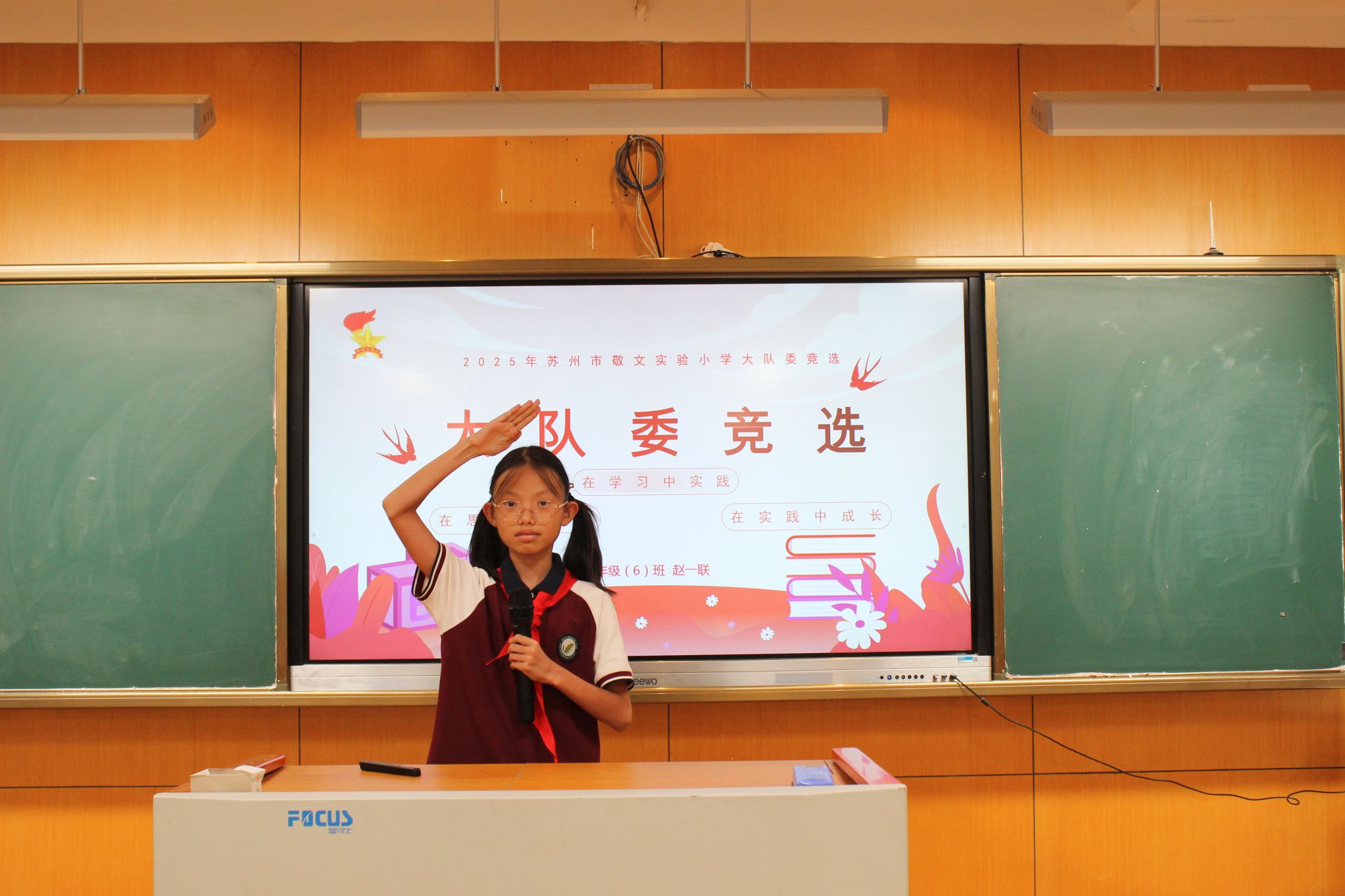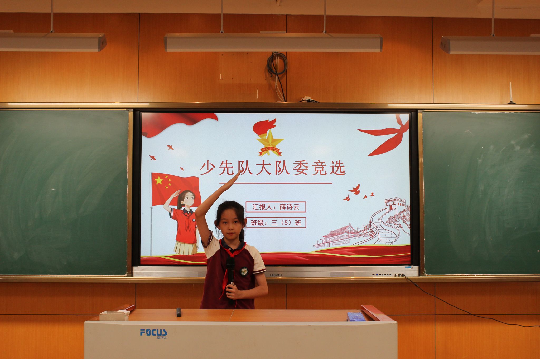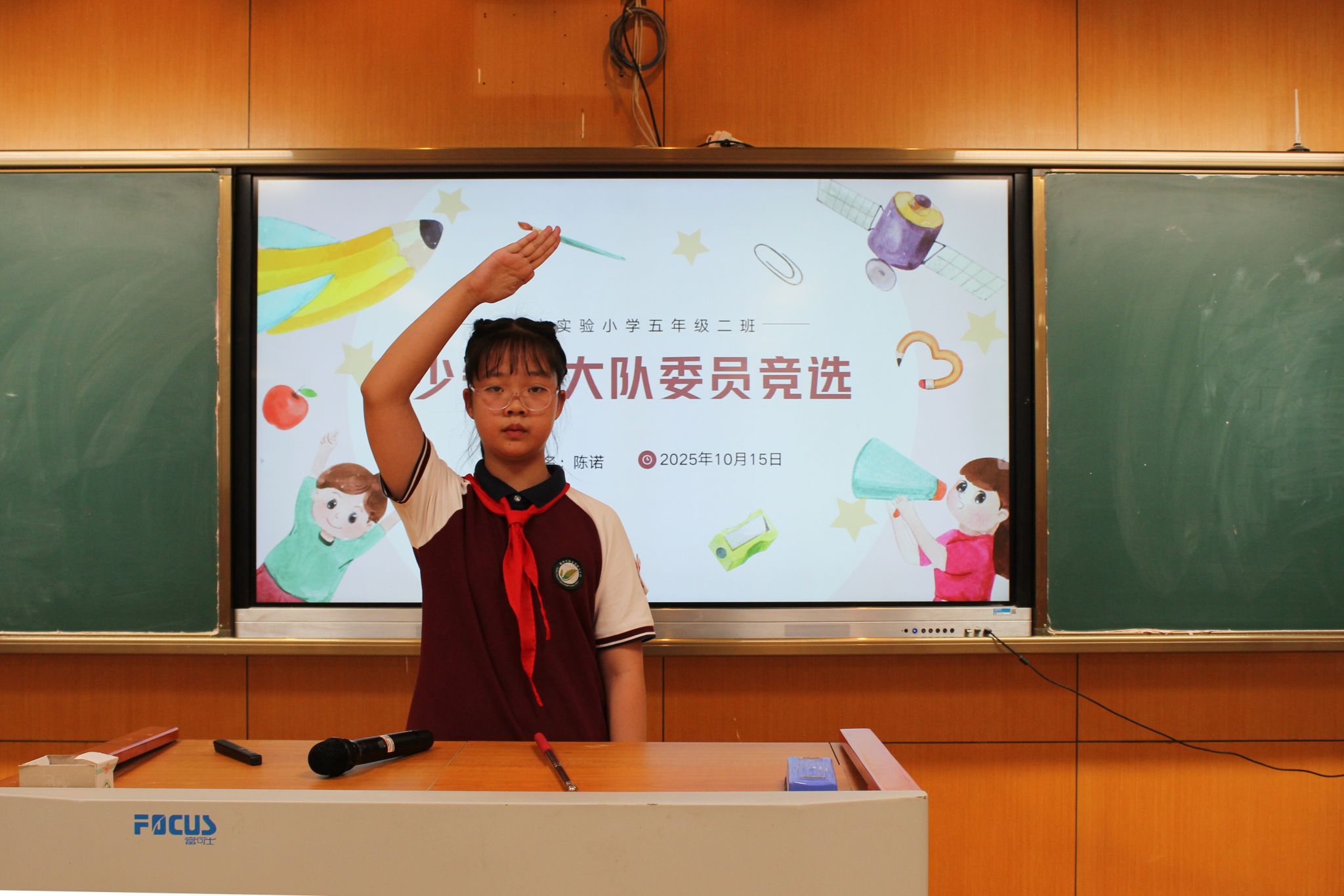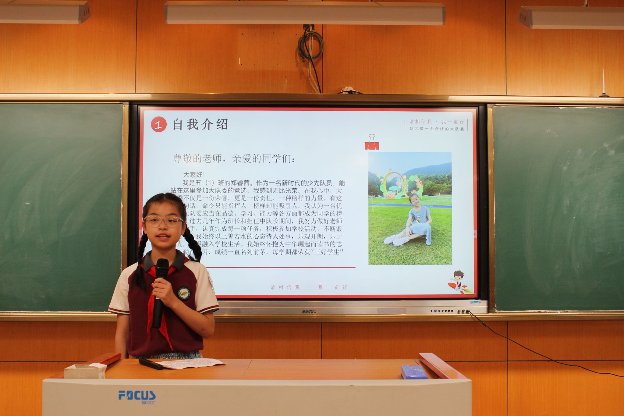 紧接着,大队委候选人发表了选举演讲,表达了自己为学校、为同学服务的热情与决心,展现了自己担当榜样的能力。