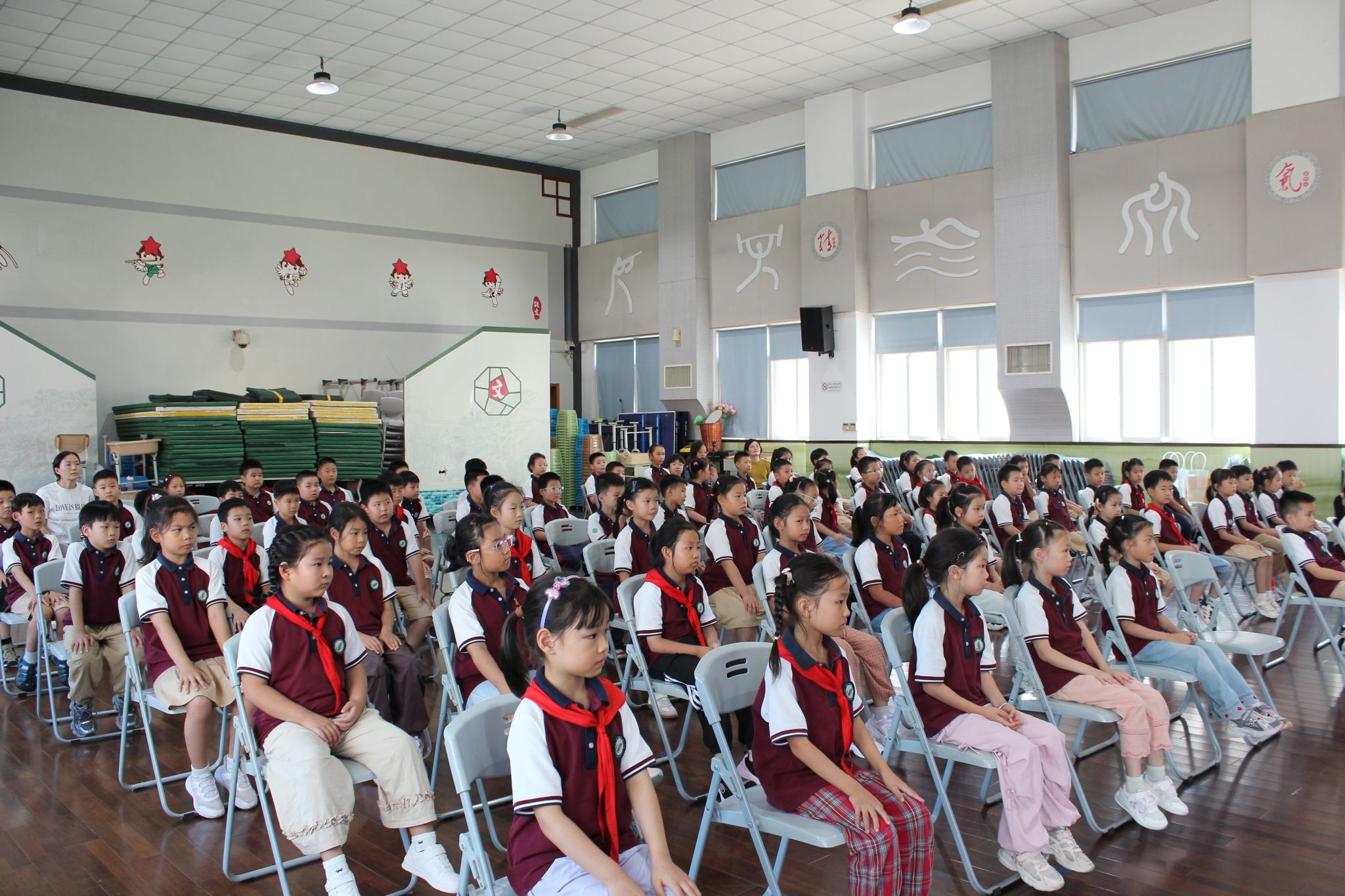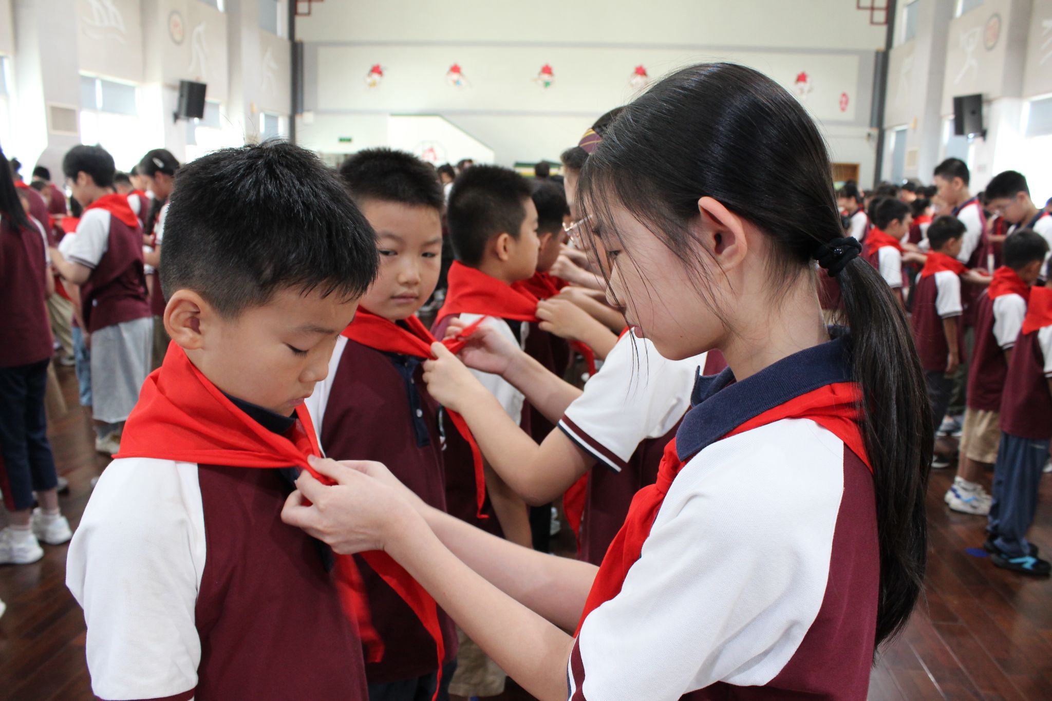 红领巾胸前跳跃,誓言耳畔铿锵,一场庄严而又充满希望的新队员入队仪式在体育馆拉开帷幕。阳光与笑脸辉映,激动与自豪洋溢。新队员们个个精神抖擞,齐唱《中国少年先锋队队歌》。他们戴上红领巾,成为了光荣的少先队员。