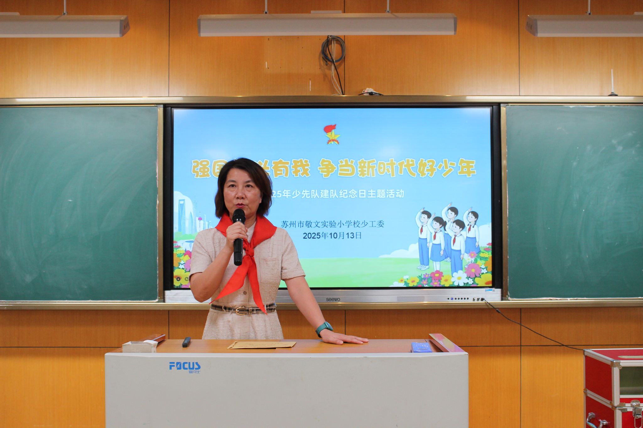 敬文实验小学校党支部书记孙霞芳带来致辞,希望少先队员们听党话、跟党走,时刻把祖国和人民放在心中,长大后成长为共产主义事业的接班人。