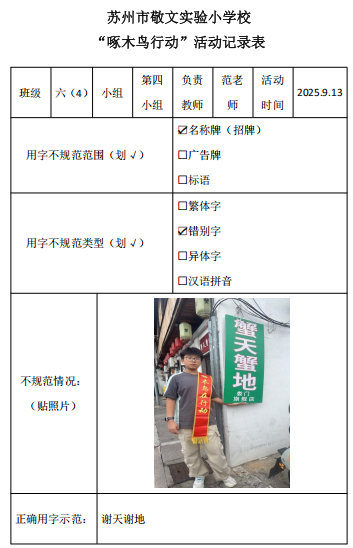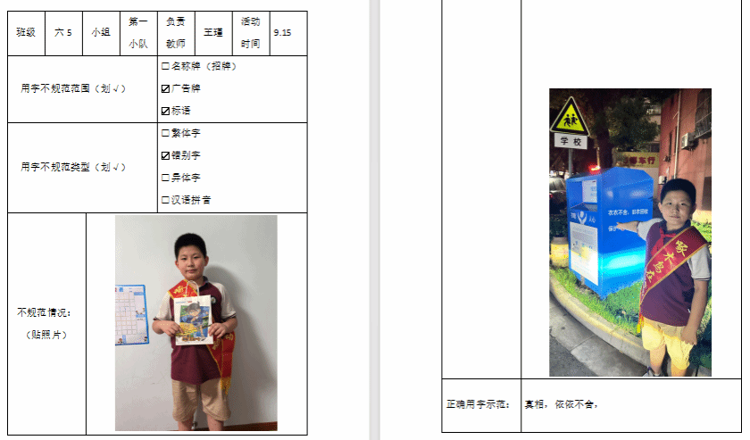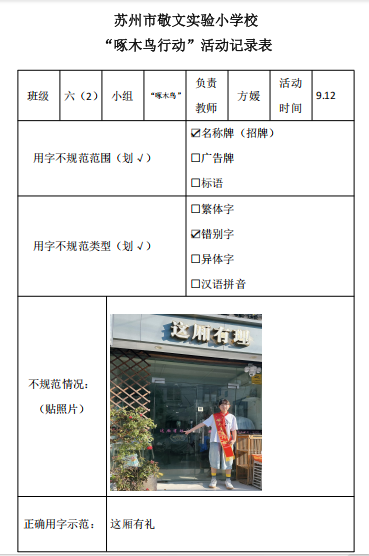 六年级的同学们纷纷化身“啄木鸟”,走进街道社区,对周边的不规范用字和病句展开调查、修正与反思,成为汉字文化的小小守护者。
