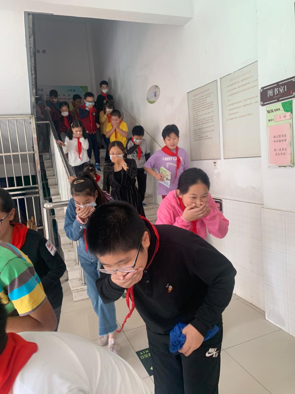 “滴——”警报响起,消防演习开始了,同学们正在图书馆看着,听到警报声,立即放下书本,捂住口鼻,半蹲着身子,迅速撤离,奔向到操场。