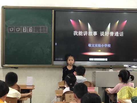 2020年9月16日,一年级三班举行了“我能讲故事、推广普通话”的主题班会系列活动,该活动是学校结合课堂教学、德育工作和校园文化建设实际,广泛开展丰富多彩的活动,活动之前,布置准备一个小故事或者一首诗歌,教师将宣传普通话的图片和文字做成PPT在班级展示,并且邀请同学上讲台,在全班面前讲故事,讲故事之前教师提出明确要求:首先要吐字清晰、其次要放慢语速,说好普通话。有的同学为我们讲述了《海的女儿》的故事、还有些孩子在全班面前朗读诗歌《咏鹅》、《春晓》。其他同学仔细聆听,并及时纠错,教师正确领读。最后进行活动总结:汉语是我们的母语,我们的语言是世界上最简练的语言,是世界上最丰富、最美丽的语言,这样有魅力的语言需要我们每个人去推广,怎么样去推广呢,首先从我做起,说好普通话,我相信,通过今天这个活动我们班的小朋友肯定可以说好普通话!
