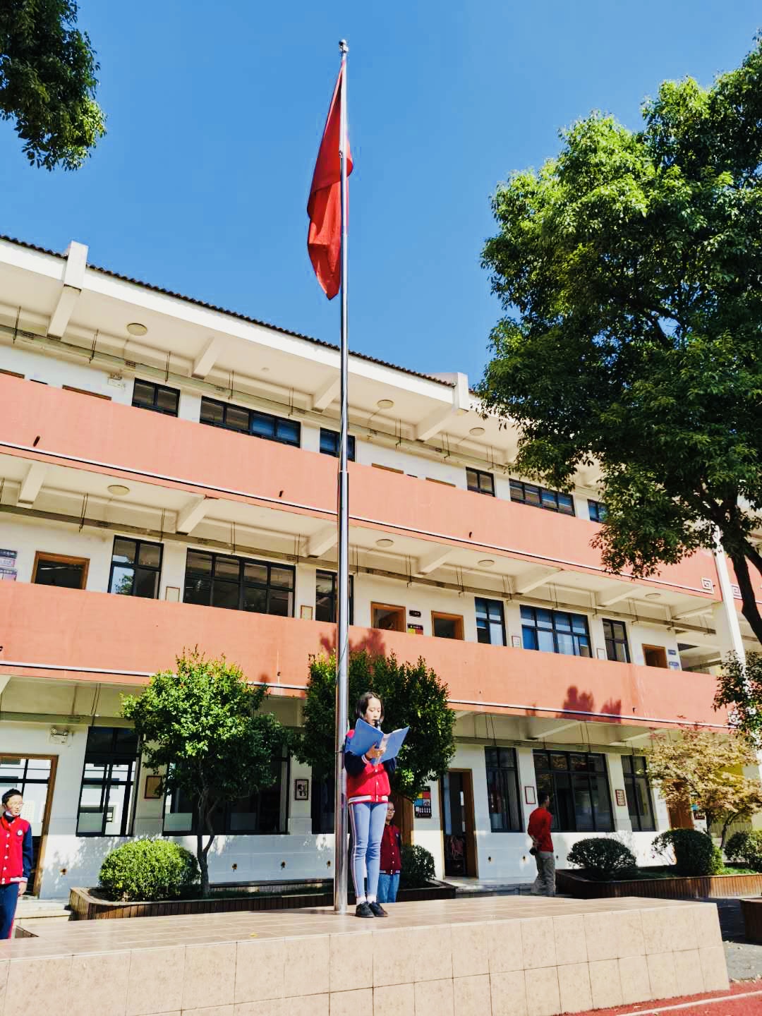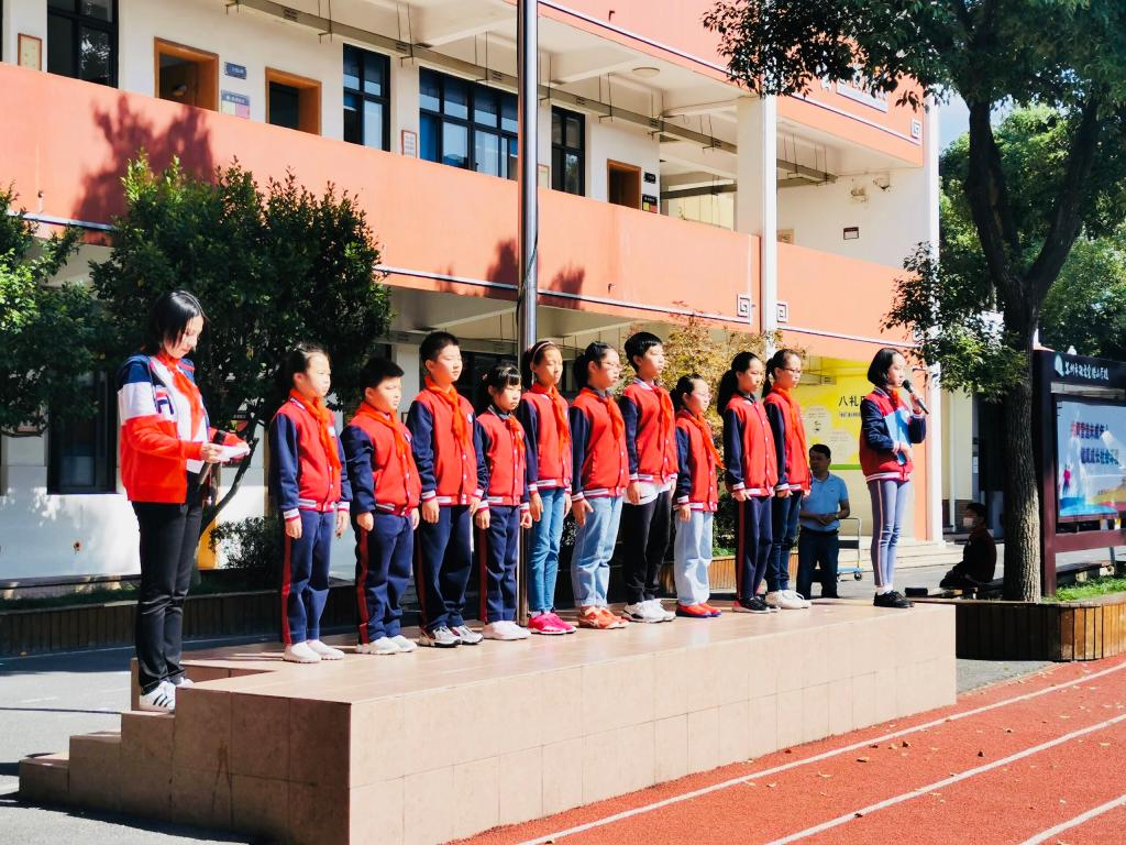 在激昂的少先队出旗曲中,旗手们迈着坚定的步伐出旗,火红的队旗高高飘扬,星星火炬闪耀着金光,全体少先队员们严肃崇敬,老师们认真慈和。