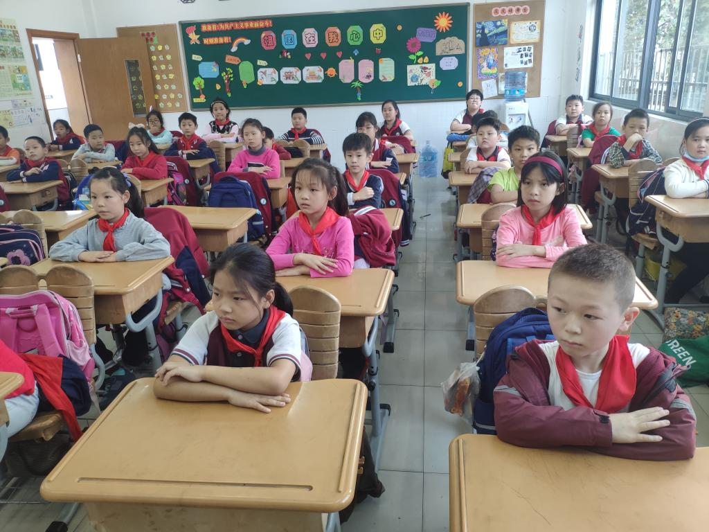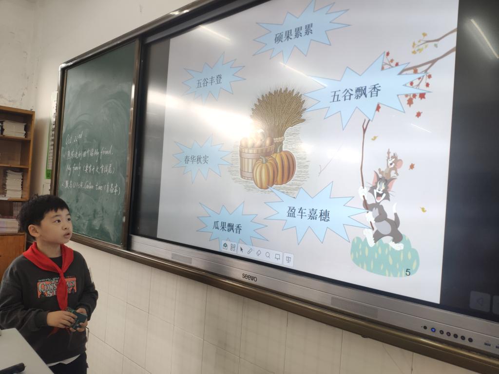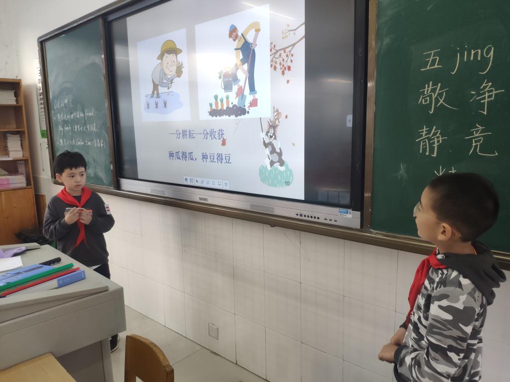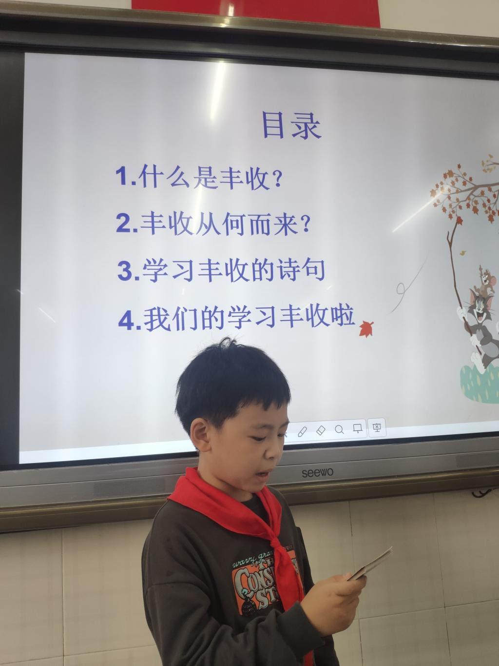 在今天队会课上,中队委员杜辰一就“小小丰收节”这一主题,从丰收的概念、丰收的由来、丰收的诗句、再联系到我们的学习生活,生动而又具体地讲述了他对“丰收”的认识和理解。台下的队员们都听得很认真,在杜辰一的带领下,一起朗诵着相关诗句和谚语:“锄禾日当午,汗滴禾下土。”“春种一粒粟,秋收万颗子。”“一年好景君须记,正是橙黄橘绿时。”“种瓜得瓜,种豆得豆。”“一分耕耘一分收获。”“读书破万卷,下笔如有神。”在朗读的过程中,队员们深深地体会到耕种的不易与收获的喜悦。