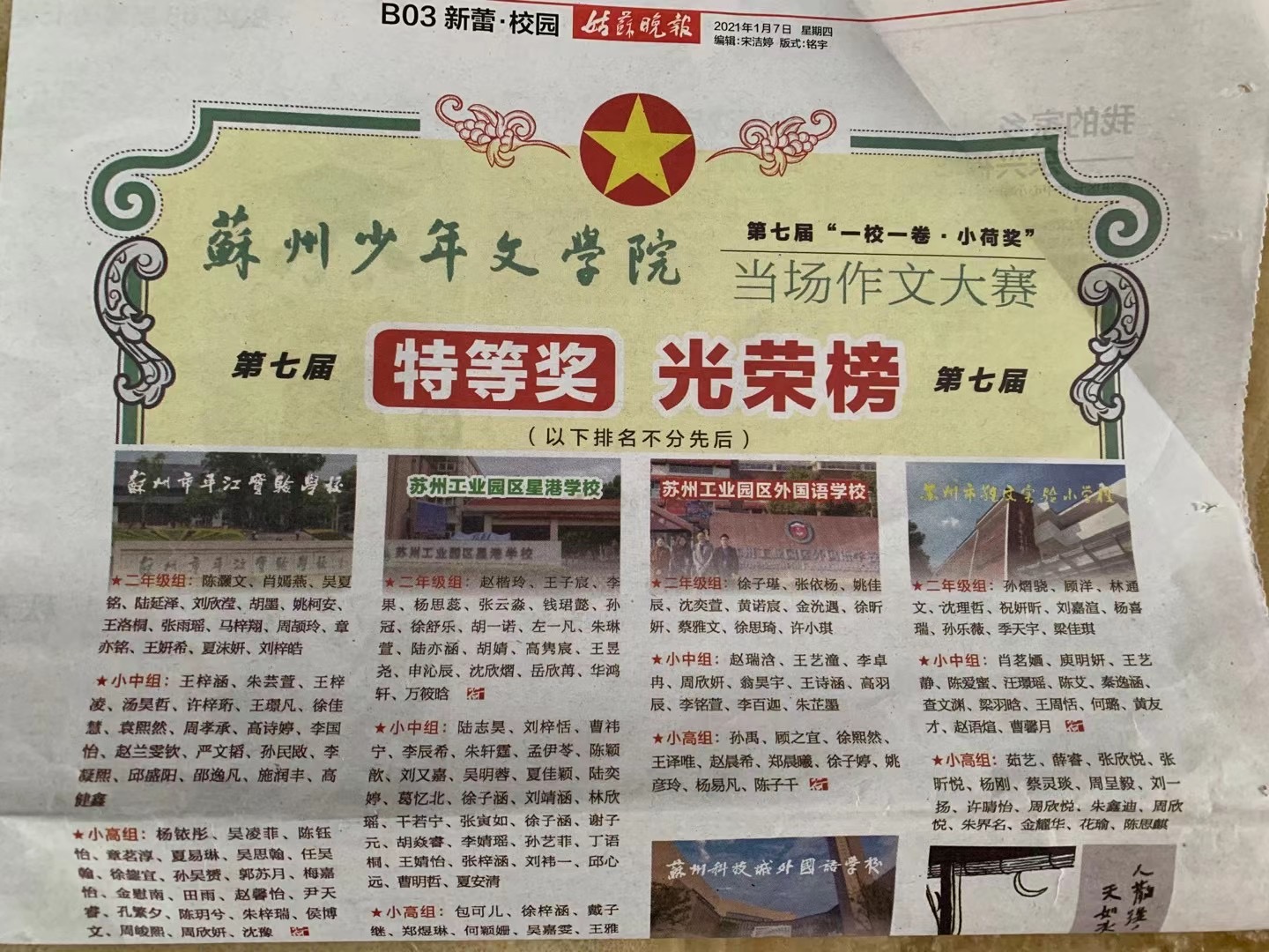 由苏州少年文学院举办的第七届“一校一卷 小荷奖”当场作文大赛已落下帷幕。我班共43人参加,其中黄友才同学荣获“小中组”特等奖,杨晨昊、王之宸、陆俞菲、沈欣颖、程烨磊5名同学荣获“小中组”一等奖,另外还有十多名同学分别荣获二等奖、三等奖、优秀奖。同学们在此次当场作文大赛中根据新颖独特的题目要求,仔细审题,积极思考,认真撰写,善于做生活中的有心人,捕捉住发生在身边的生动、有趣的情景,并用惟妙惟肖、栩栩如生的语言描述出画面,个个都是小作家,真是“小荷才露尖尖角”啊!