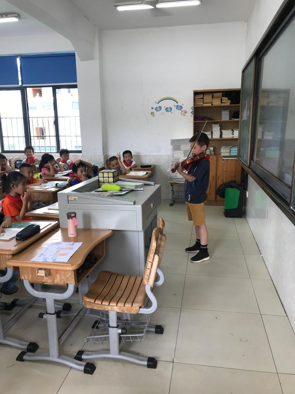 音乐是一门艺术,一门陶冶情操的艺术,美妙的音乐经过几千年的传承,成为了经典。欣赏音乐,使我们的心情愉悦,荡涤心灵的疲劳,忘却尘世的纷纷扰扰,回到过去那纯真年代,欣赏音乐,让我们暂时放下尔虞我诈的功利性,融入神奇的音乐世界,在哪里,没有激烈的竞争,没有为了利益厮杀的画面,留给我们的,只有那一个个悦动的音符和婉转的旋律。二(2)班的周子千同学,学习小提琴已经两年了,他这次参加少年宫的交响乐团选拔,成为了少年交响乐队的正式成员,今天他把音乐带到了学校,让同学们也接受音乐的熏陶。