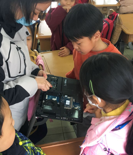 3月5日,一(1)班的欧阳佳明妈妈走进了我们班,受到了同学们的热烈欢迎。她结合自己的工作经验,带领孩子们走进了神奇的计算机的世界。首先给她向同学们讲解了一下计算机的含义。然后通过与同学计算100题10 以内加减法需要的时间比赛,说明计算机的运算速度是非常快且准确的。接着,一张张精美的图片,与同学一起学习了计算机的组成部分。欧阳佳明妈妈还特地带了一台拆开后盖的笔记本电脑,同学们能近距离观察了计算机的硬件,对笔记本的硬件有了一个初步的认识。整堂课孩子们专注地倾听,积极地参与,踊跃地发言,学习情绪相当高涨。