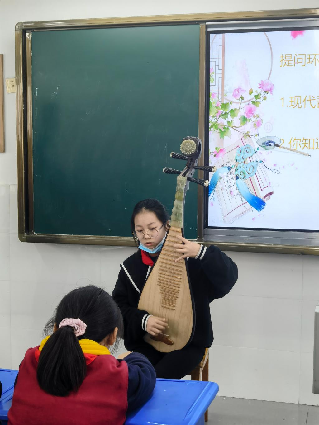 课上,吴爸爸给同学们讲述了琵琶这种乐器产生及演化的历史等知识,并讲解了琵琶的一些演奏技巧。吴爸爸又用琵琶为同学们演奏了一曲,同学们听得意犹未尽。随后又请了几位同学上去直接感受琵琶的弹奏方法。