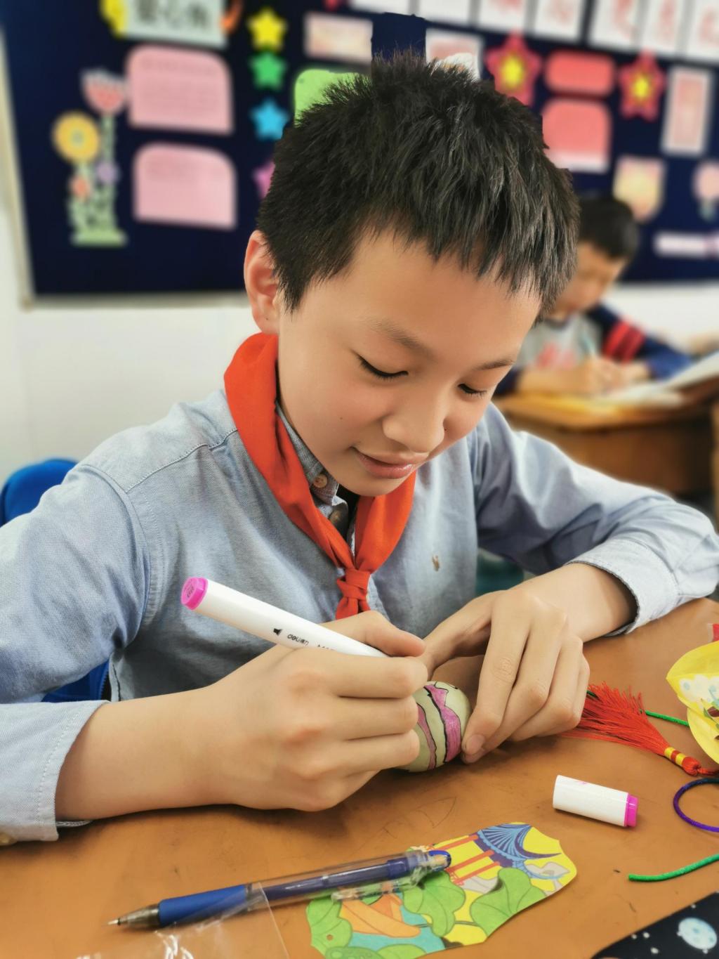 立夏节气,全班同学参加了立夏传统活动。同学们在咸鸭蛋上绘彩图,做网袋,斗蛋,在趣味的活动中感悟传统节气的习俗。
