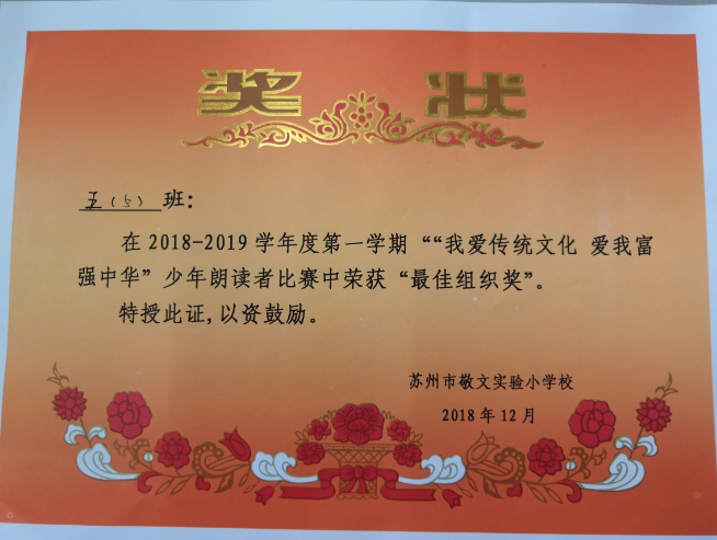 12月20日,苏州市敬文实验小学五年级同学进行了朗诵比赛。同学们积极准备,认真排练,以饱满的姿态参与比赛,五(5)班同学最终获得“最佳组织奖”。