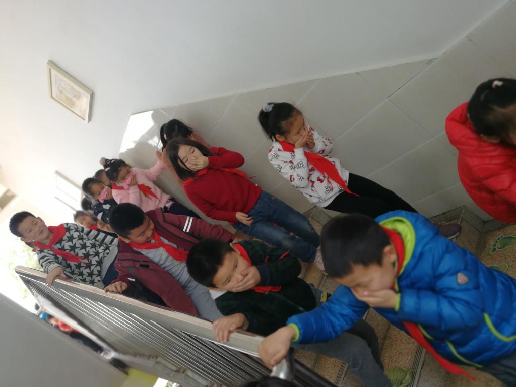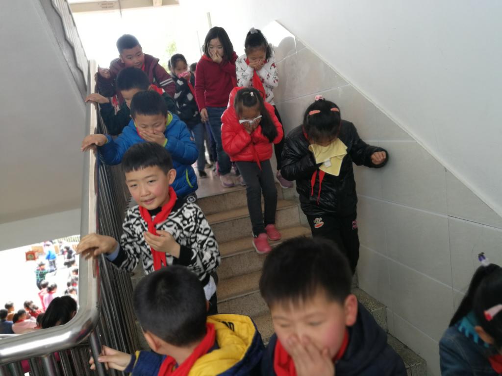 中午,校园内响起警报声,各位老师立即到达指定岗位,引导教室内学生快速疏散。各班任课教师带领学生弯着腰、猫着步,用手帕、毛巾等捂住口鼻,沿着学校指定楼梯口快速前进,有序撤离到教学楼前大操场,随后各班清点人数,并进行汇报。