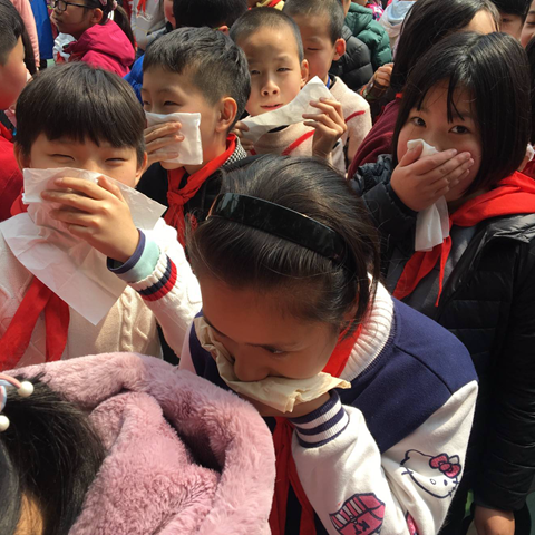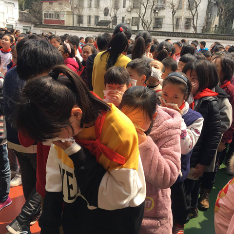 中午12时25分,五(3)班同学们正在教室中安静地学习。“呜——呜——”突然,一声急促的警报声响起了,划破了校园的寂静。同学们在老师的指挥下,迅速整队,从班级门口撤离。大家用湿纸巾捂住口鼻,弯下腰,撤离至楼梯口处。虽然楼梯口十分拥挤,但是在老师的指挥下,大家仍然有条不紊地下了楼,一路小跑地来到了操场上。