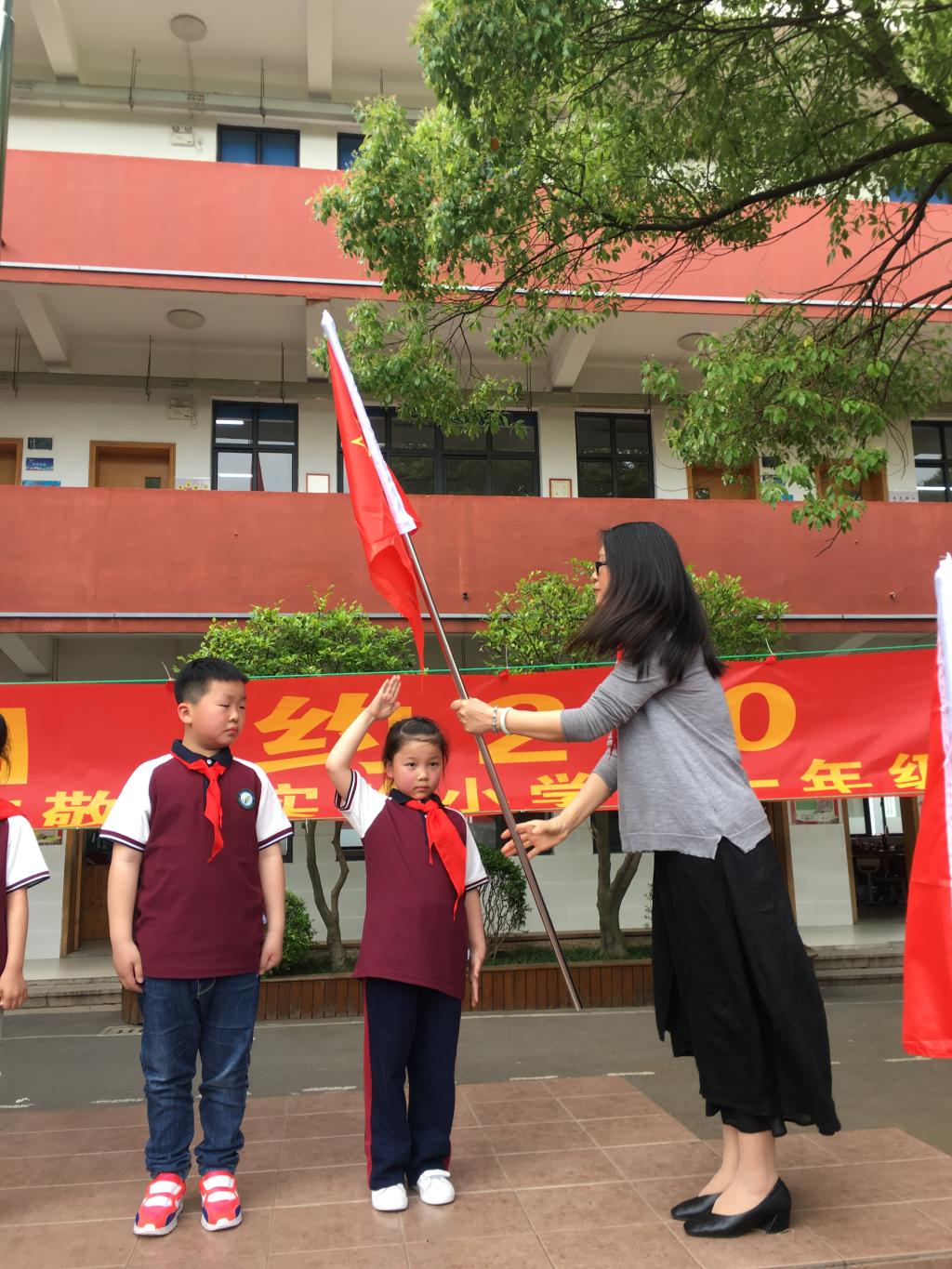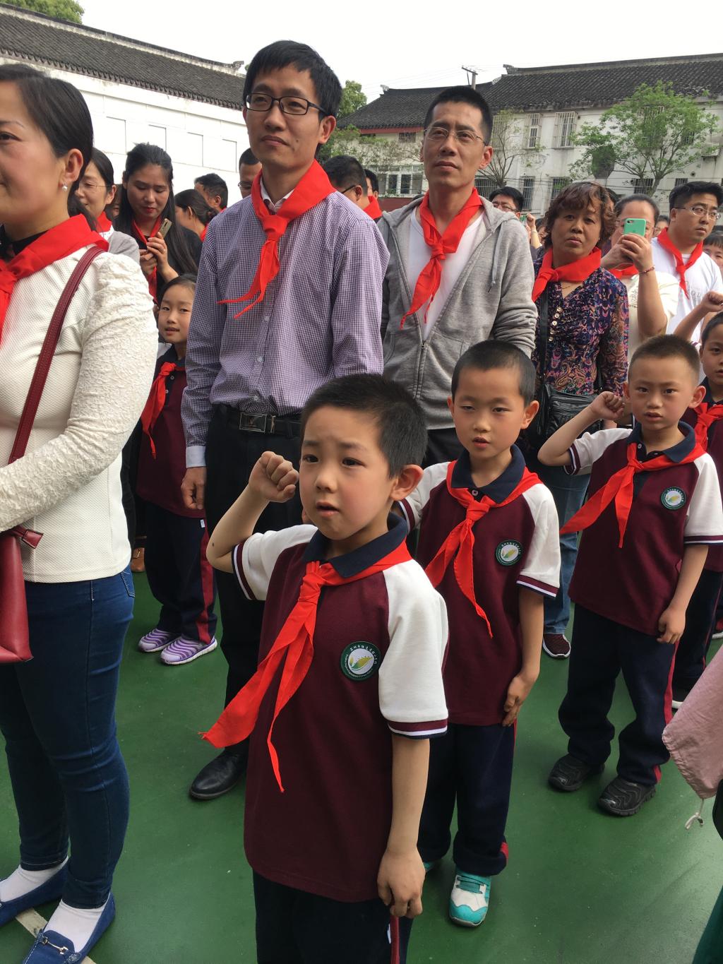 5月10日下午,阳光普照在敬文校园的大操场上,一切是那么美好。我们一年级全体学生和老师、家长欢聚在一起,举行一年级入队仪式。音乐响起,6个班的小朋友们充满激情地大声唱起了《中国少年先锋队队歌》。之后,家长们给孩子认认真真地戴上了鲜艳的红领巾,小队员们个个握紧拳头庄严宣誓:“时刻准备着!”瞧,陆书记正在给我们一(1)中队授队旗呢!中队长耿知好小脸红扑扑的,表情严肃,接过队旗,向书记敬队礼。此刻,所有一(1)中队的少先队员们既兴奋又激动,纷纷和家长合影留念。