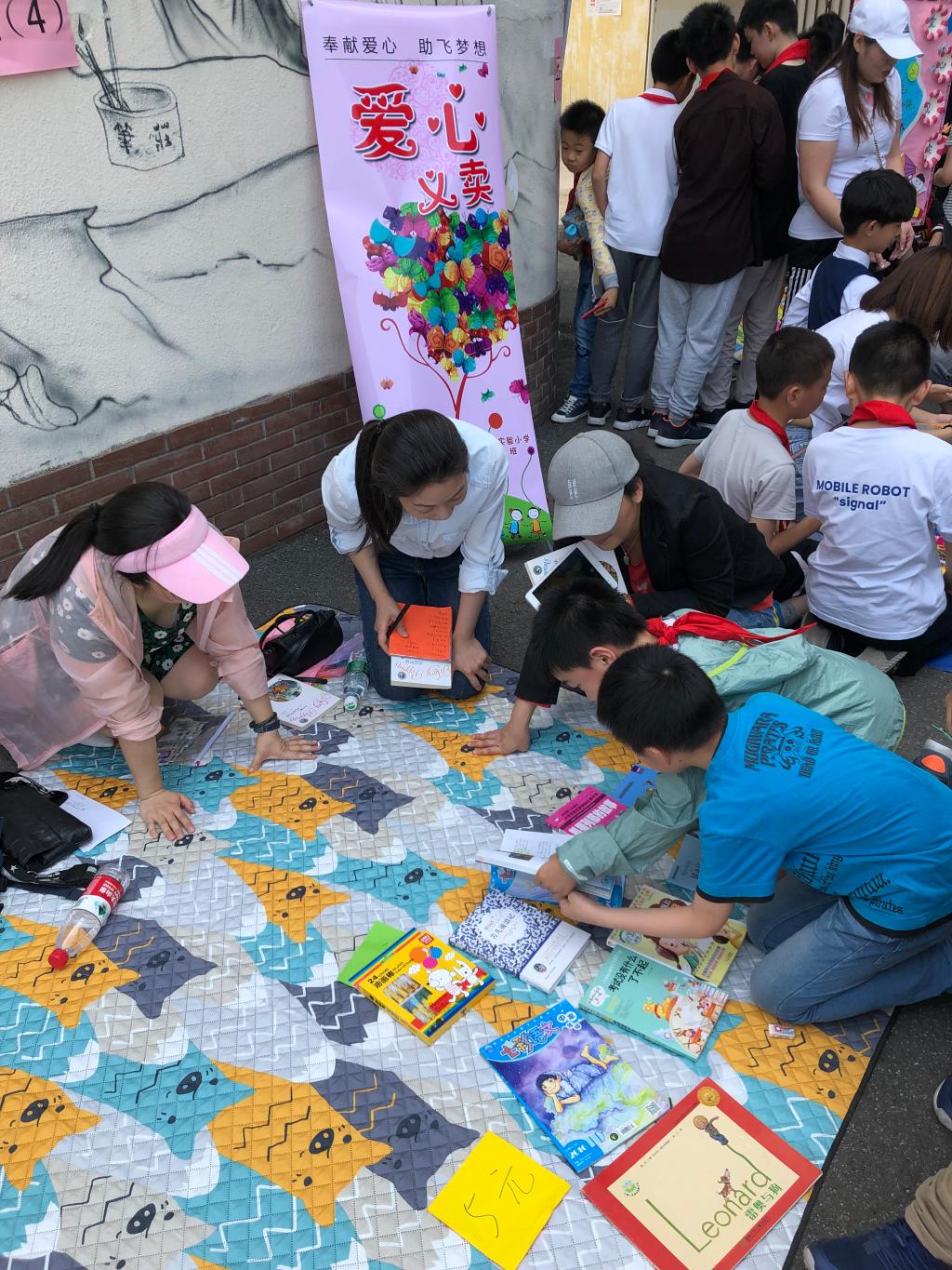 我校举行了爱心义卖活动。同学们无比激动。在老师带领下,同学们有序的下楼,前往大操场。到了大操场,老师说自由活动时,同学们拿着各自的钱去买自己喜欢的书籍和物品。有的人满满一大堆,而有的人却是空手而归或是只有一个两个的。不过大家都开心的不亦乐乎。我校爱心义卖活动圆满完成。