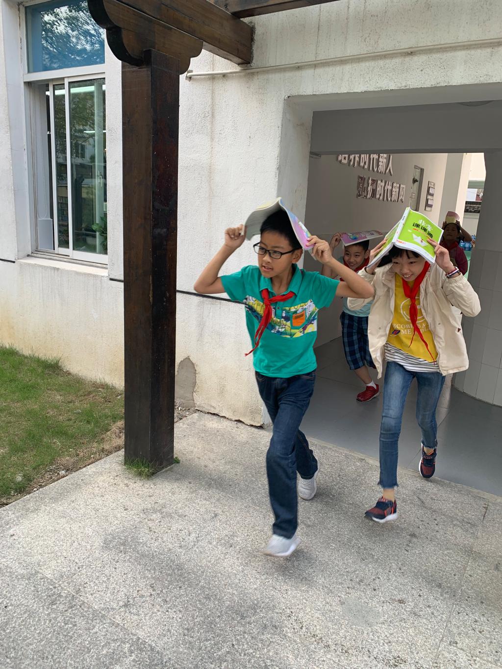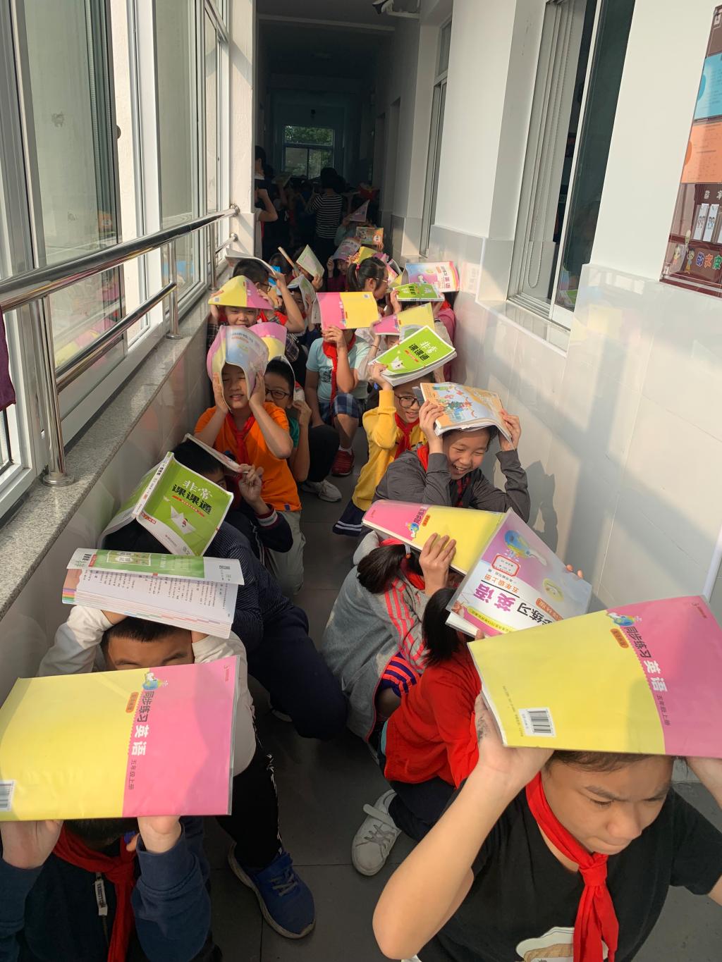 同学们拿起一本厚厚的书,放在头顶上,保护好自己的头部,迅速从疏散路线撤离教学楼,赶往操场集合。