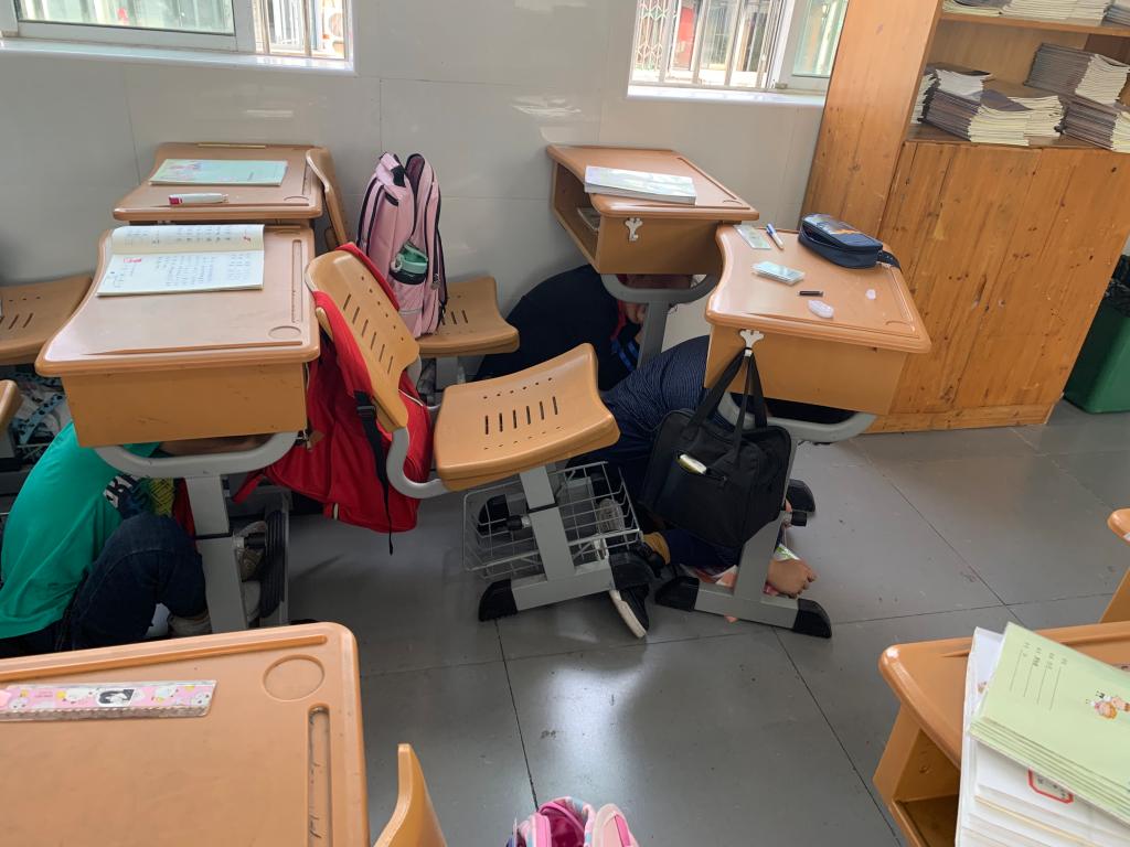 同学们一听到避险警报,立刻钻到课桌底下,静待不动。