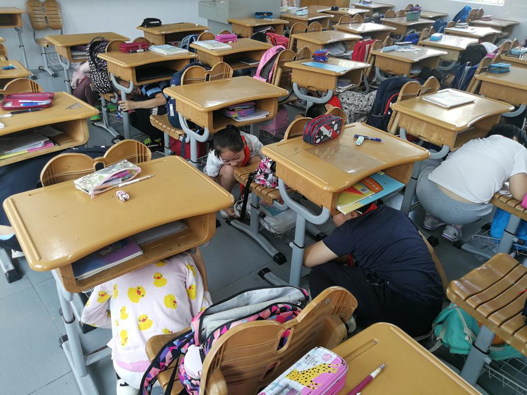 课堂上,突然刺耳的防震警报传遍了整个校园,同学们一听,立刻开始了避险。“唰”的 一声全班同学都躲到了课桌的下面,以迅雷不及掩耳之势钻到了课桌底下。