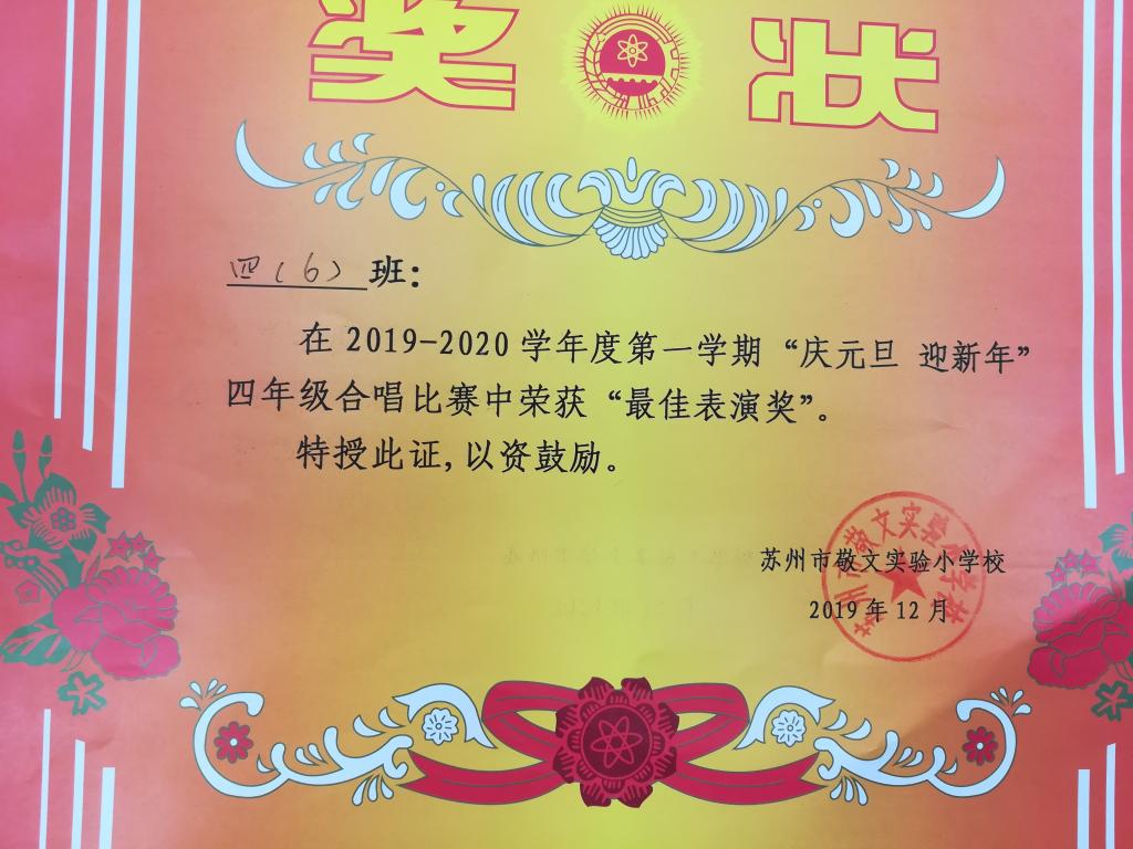 2020年年初,我们迎来了合唱比赛。赛前,我们克服重重困难,认真排练:胡老师悉心指导;家长们全力支持,为我们购买服装;老师让出语文课给大家排练。终于,我们在比赛中以绝对的优势获得了第一名的好成绩。大家在激动之余,不忘对胡老师说声:谢谢!
