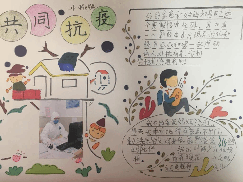 我班程烨磊小朋友活泼可爱,成绩优异,是一名品学兼优的运动男孩。他的妈妈是相城人民医院的一名内科医生,在抗疫特殊时期,每天不是在发热门诊,就是在隔离病房,工作十分辛苦,每天早出晚归,没时间陪伴孩子。可是,小磊同学却更加懂事了。他每天合理安排生活作息,自觉参加线上学习,积极在家进行体育锻炼,帮助爷爷奶奶干家务活,还亲手制作抗疫小报,为妈妈加油,为武汉加油,为中国加油,真是个关爱家人、关爱生命、关爱世界的好孩子!