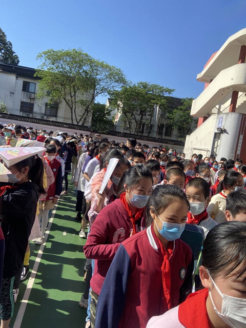 正值晨会课,同学们都在认真聆听老师上课。突然,随着一阵刺耳的警报拉响,演练正式开始。各楼层都有老师在楼梯口维持秩序。各班正在教课的老师迅速组织学生就近躲在课桌下,双手抱头,30秒后,疏散命令(二次警报)下达,学生开始在教师的带领下按照学校平时规定的路线有序排队撤离。撤离过程中,学生能够按照要求用书包或书本保护自己的头部,并注意不推挤和喧哗,靠近墙体快速离开教室,防止踩踏事故的发生。仅用了1分37秒,全校所有师生全部有序撤离到学校操场的安全宽敞地带,随即各老师清点人数,各班向校长报告防震逃生情况,整个逃生演练过程迅速而有序,未发生其他事故。