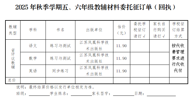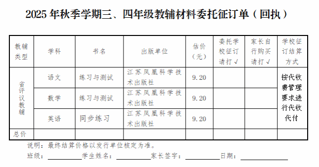 我校根据相关文件要求,分学科组建教辅选用委员会,根据“一科一辅”原则、课程教学需求和学生实际情况,通过规范流程从《市级教辅推荐目录》内选出2025年秋季学期3-6年级选用材料,并就有关征订事项告知如下: